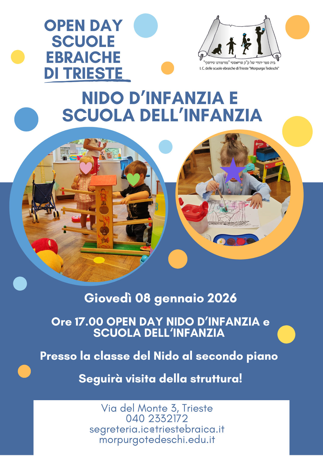 Il giorno martedì 08 gennaio 2026 si svolgerà, presso la classe del nido al secondo piano delle scuole ebraiche di Trieste (Via del Monte 3), l'OPEN DAY per la scuola dell'infanzia e del nido d'infanzia!
